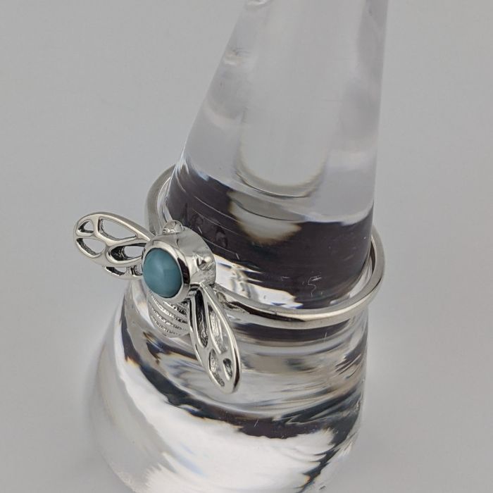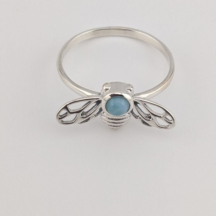 Presenting the "BEE BRAVERY" Ring, a dainty 4.x4mm Larimar gemstone set in .925 sterling silver, renowned for its restorative qualities. This exquisite .5" L x 13/16" W Bee design ring represents bravery and cooperation, reflecting the group effort to combat child trafficking and raising awareness of this very serious and real issue.