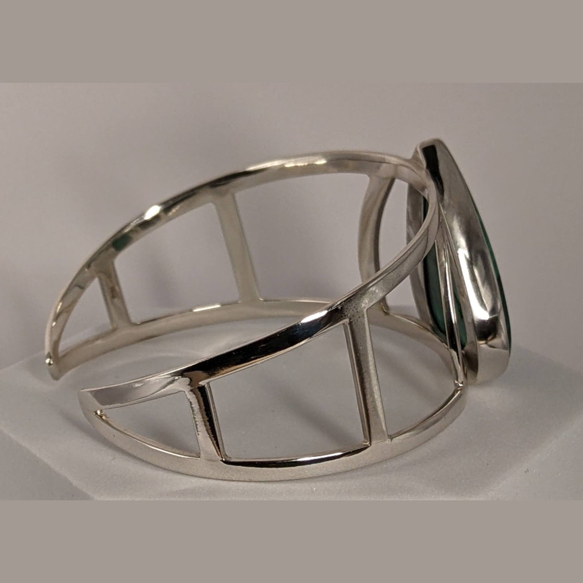 Adorn your wrist with the timeless elegance of our Malachite & Sterling Silver teardrop cuff bracelet, featuring a captivating 1.5" x 1" Malachite teardrop. Its flexible cuff design gently opens to accommodate most wrist sizes, making it a versatile piece for both men and women, while the enchanting green Malachite color adds a touch of natural beauty to your ensemble. Remember, to preserve its longevity, avoid excessive bending of the metal over time.