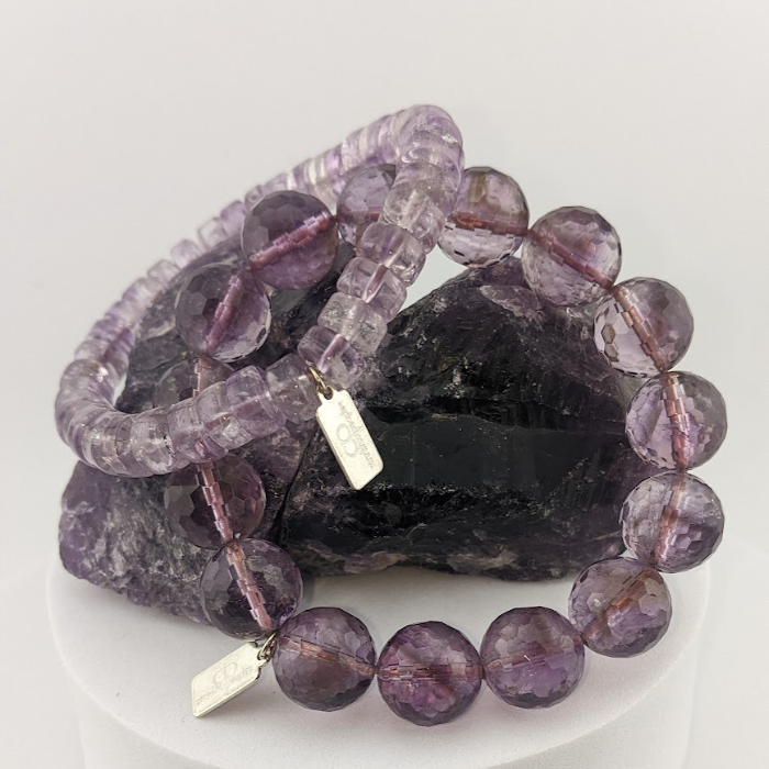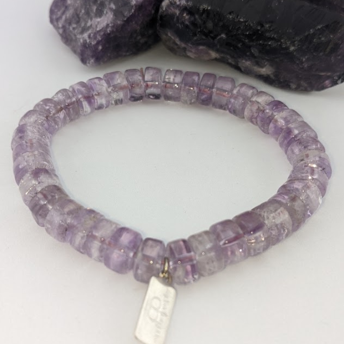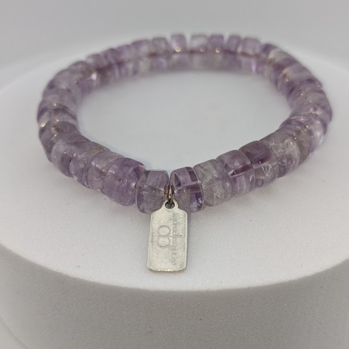 Beautiful round flat Lavender Amethyst gemstones, measuring 5/16" tall and 1/8" wide, are featured in "Divine Downloads"' exquisite amethyst bracelet. The jewels are strung on sturdy, flexible elastic. These elegant and graceful beads are perfect for wrist sizes between 4.5 and 6 inches. A sterling silver tag adorns this bracelet, which adds a touch of exquisite beauty to your attire while embodying exclusivity and sophistication.