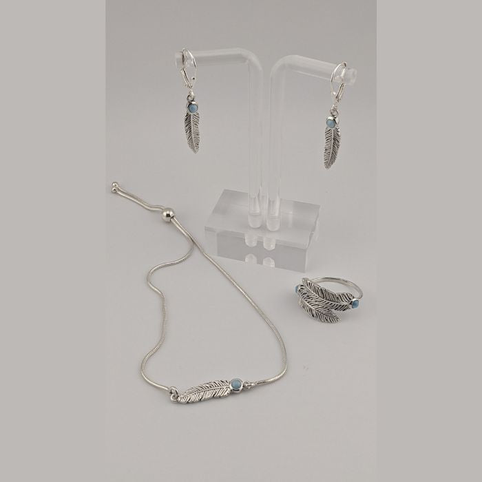 "Feathered Freedom" pendant Ring features 3x3mm Larimar gemstones set in .925 sterling silver, measuring .5 inches long. This light-weight piece embody the lightness and freedom of feathers, symbolizing hope for liberated lives while raising awareness about disrupting child trafficking and showcasing the beauty of Larimar.