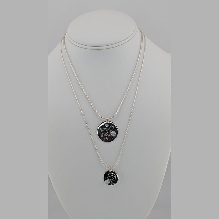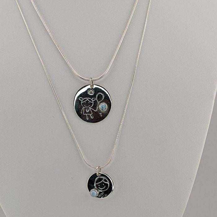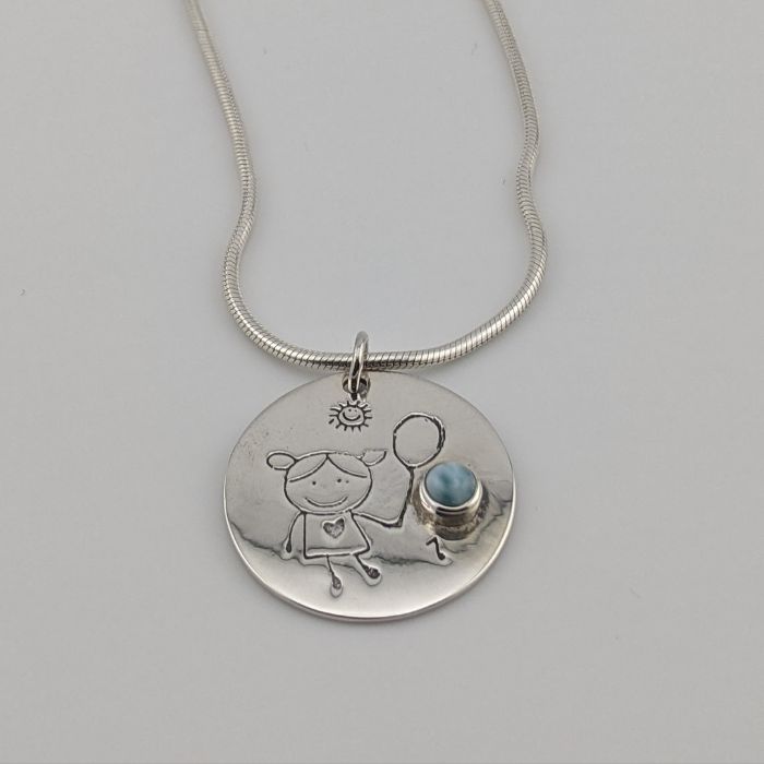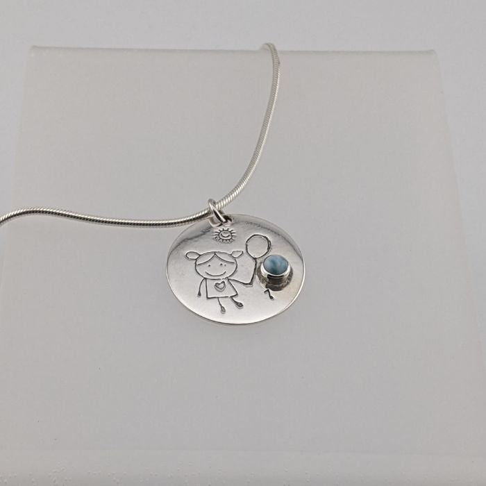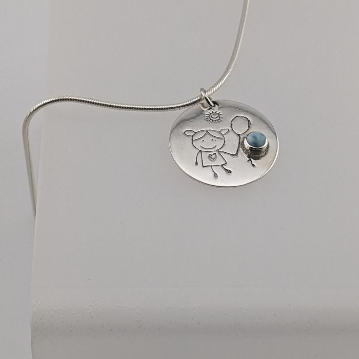 A 5x5mm round Larimar gemstone, finely carved with a scene of a child playing under a bright sun, is set in a 1" L x 1" W sterling silver pendant for the "Lighting the Path to Play" pendant necklace. This magnificent pendant, which is suspended on a sterling silver chain, represents freedom and hope. It also highlights the soothing and relaxing qualities of Larimar and raises awareness of the issue of child trafficking.