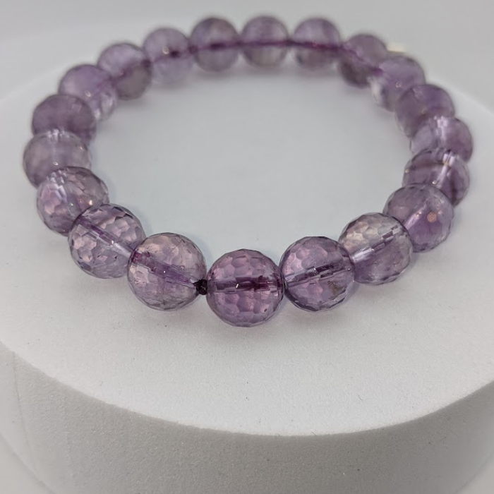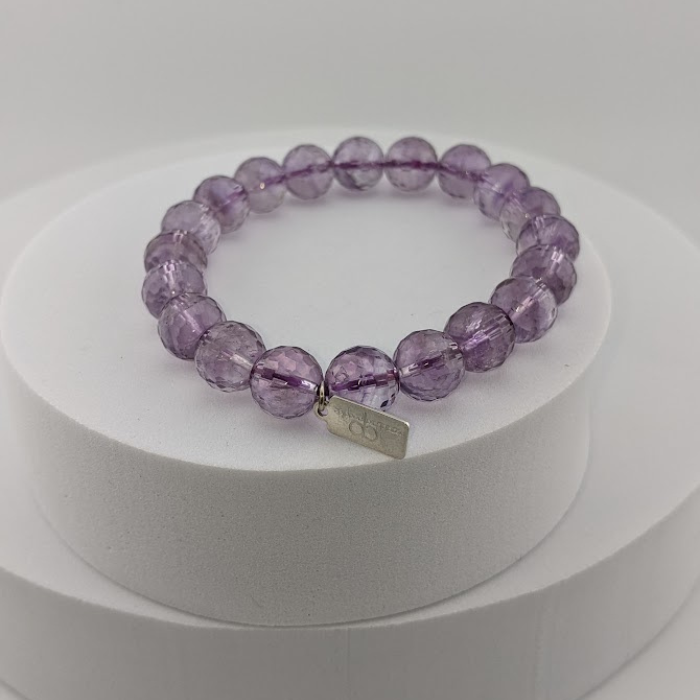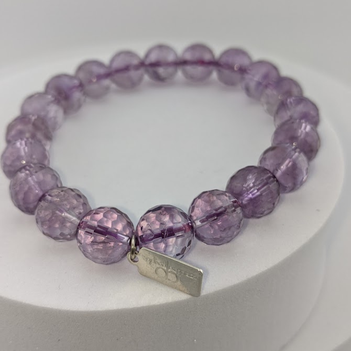 "Pigments of Amethyst" defines luxury and spirituality with this stunning bracelet, featuring lavish lavender round faceted Amethyst gemstones measuring 1cm each. Crafted on durable stretchy elastic, it comfortably fits wrists from 6 to 7 inches. Adorned with a Sterling Silver tag, this piece transcends into a realm of opulence and exclusivity. Permit me to use this beautiful accessory to compliment your sense of style and spiritual frequency with the ethereal charm of amethyst.
