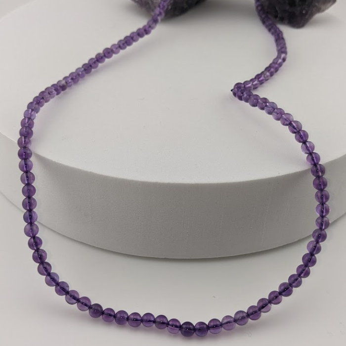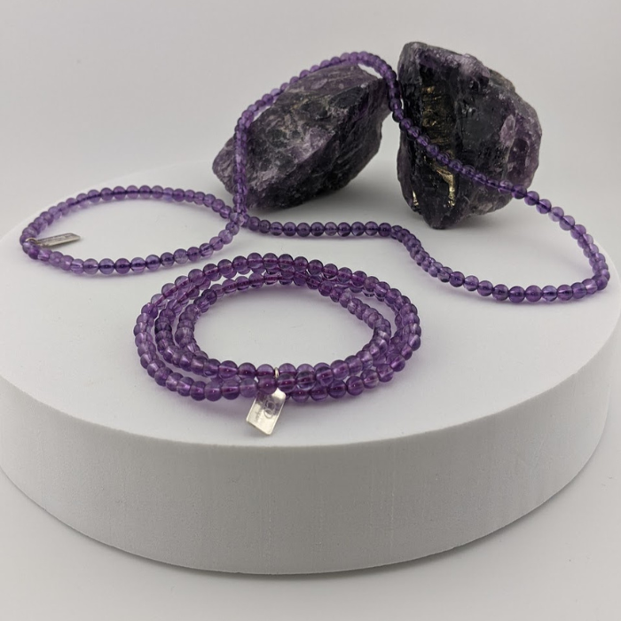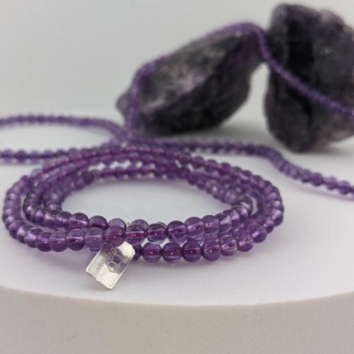 "Saturated in Composition" is an exquisite Amethyst bracelet featuring extra small .5cm lilac smooth round gemstones strung on durable stretchy elastic, designed to wrap around the average 6–7-inch wrist three times. Each bead exudes elegance, complemented by a Sterling Silver tag that signifies its exclusive collection. Embrace the luxury of Amethyst with this unique accessory.