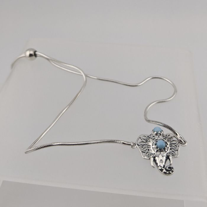 Introducing the exquisite "SOMETIMES MOMMA, SOMETIMES NOT" Elephant Bracelet, a sterling silver masterpiece adorned with a 3x3mm round Larimar gemstone, highly valued for its healing and soothing properties. Wearing this elegant 7/8" L x 3/4" W bracelet with an adjustable chain and ball honors the wisdom and gentle strength of the elephant while supporting the campaign to raise awareness and end child trafficking.