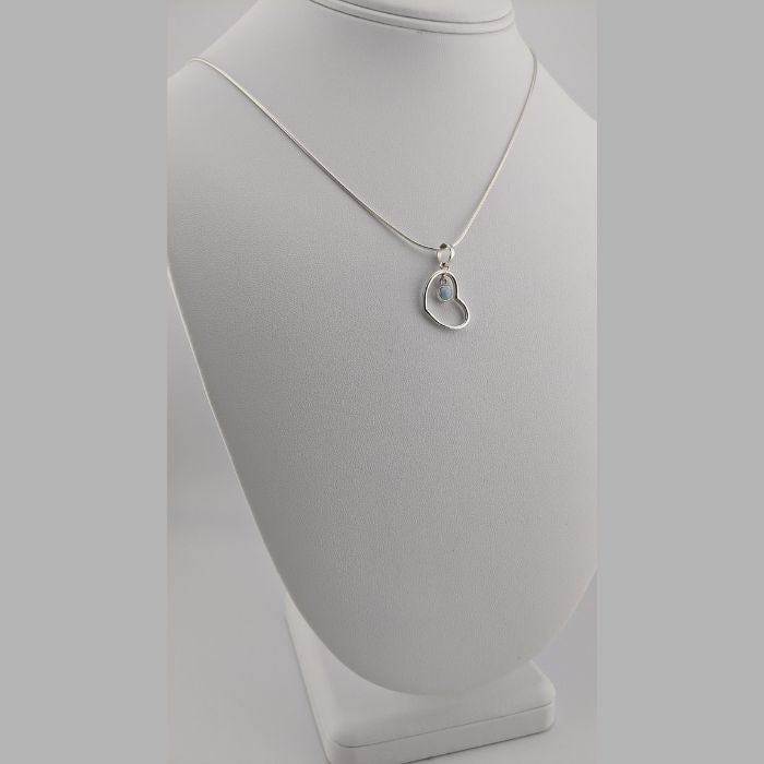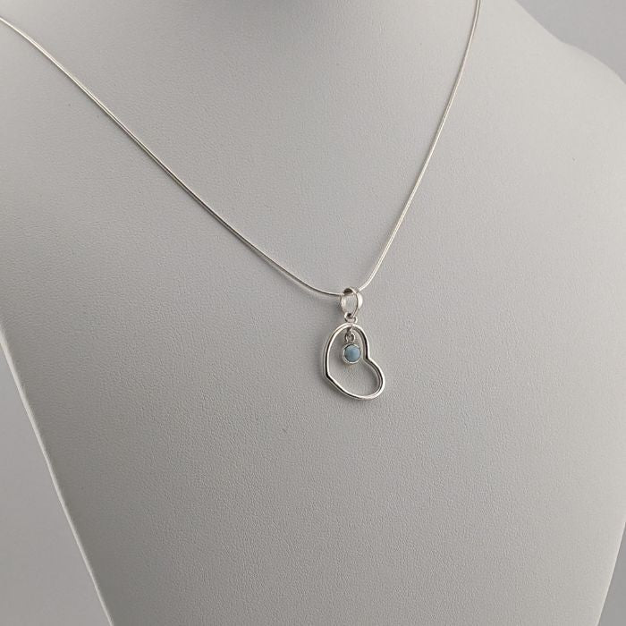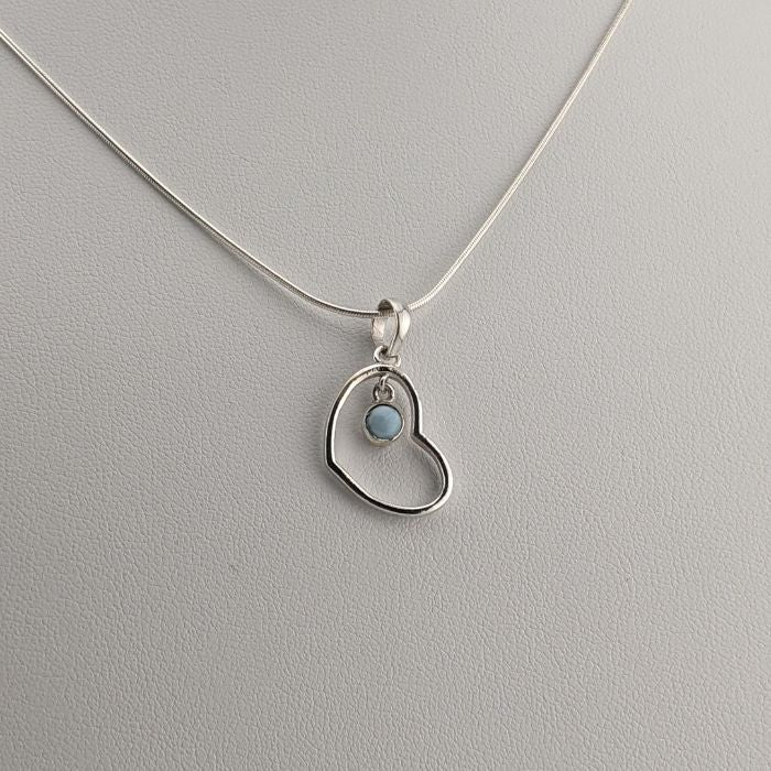 Set in a 3/4" L x 1/2" W sterling silver heart-shaped pendant, the "The Heart is a Muscle" pendant necklace showcases a 4x4mm round Larimar gemstone. This exquisite pendant, which is suspended on a sterling silver chain, represents compassion and strength. It also draws attention to the soothing and calming qualities of larimar and raises awareness of the battle against child trafficking.